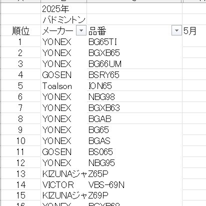 5月のバドミントン張り上げストリングランキング